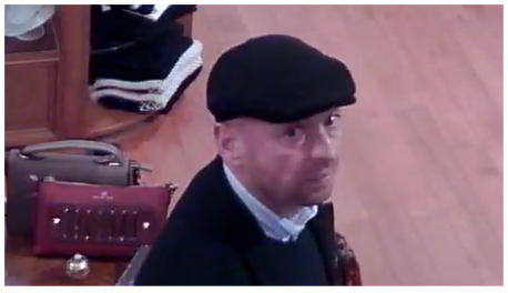 The first suspect is described as a Caucasian male, clean shaven, approximately 5'9" tall, between 40 to 60 years of age wearing a black coat and a black "newsboy" cap as seen in attached picture. The second suspect is described as Caucasian female, approximately 5'6" tall andwearing a dark jacket. The female had dark hair pinned back into a headband.