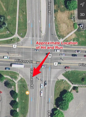 On January 18, 2018 at approximately 7:00 p.m. the suspect vehicle was traveling eastbound on Princess St. The vehicle turned right from Princess St onto Gardiners Rd to head south. A 16-year-old pedestrian was walking east, crossing Gardiners Rd from the southwest corner of the intersection. The youth was approximately half way across the two southbound lanes on Gardiners Road when the suspect vehicle struck her from behind.